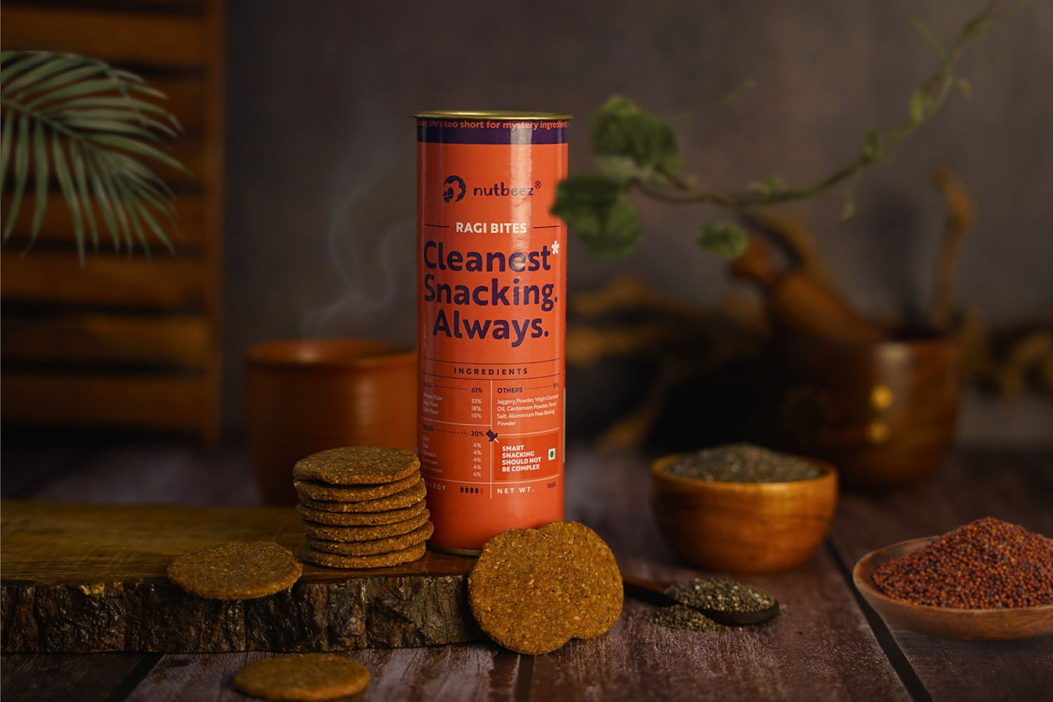 Crunchy, wholesome, and guilt-free—Nutbeez Ragi Bites are the perfect balance of health and taste. Crafted with a nourishing blend of wheat flour, ragi flour, and oats, these bites are enriched with super seeds like chia, flax, pumpkin, sunflower, and watermelon. Sweetened naturally with jaggery and flavored with cardamom, cinnamon, and a hint of rock salt, every bite delivers pure goodness without refined sugar, palm oil, or preservatives.